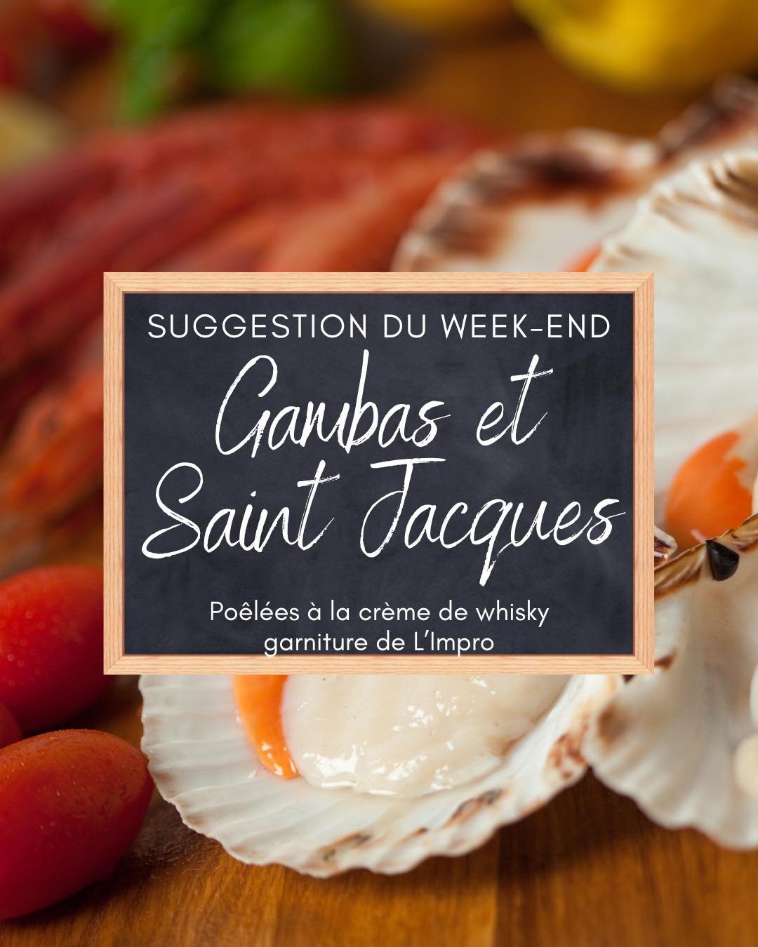 Suggestion du week-end 🌧️ à l’Impro -Gambas et Saint Jacques poêlées à la crème de whisky et risotto aux légumes 32€ –10% à empoter.