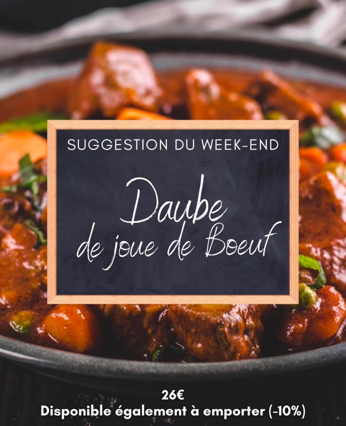 À partir de ce soir et tout le week-end : Daube de joue de bœuf et polenta crémeuse aux trompettes de la mort 26€ À emporter –10%.