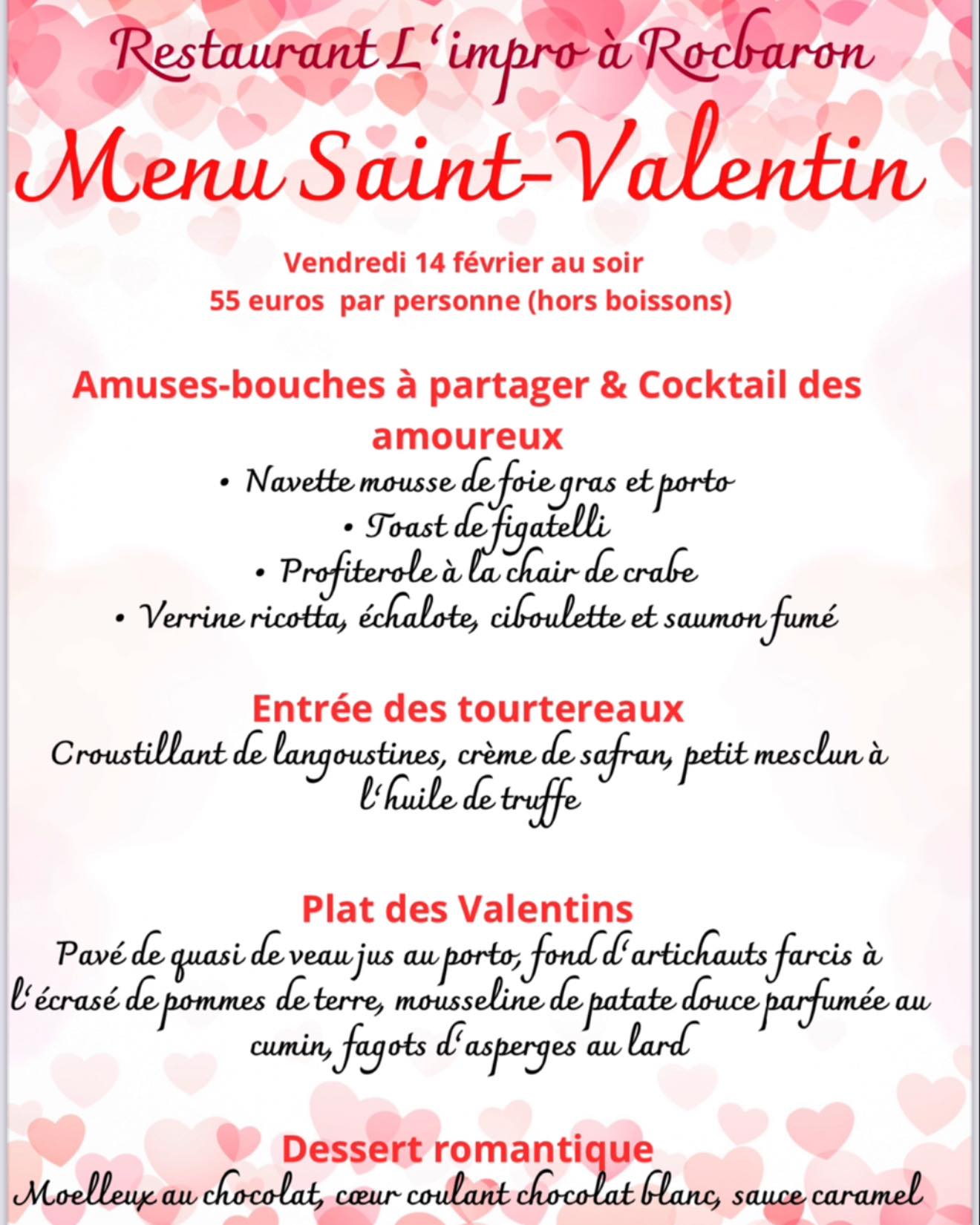 🩷Menu de la Saint Valentin 🩷Le vendredi 14 février au soir, venez célébrer la fête des amoureux dans notre restaurant ! Découvrez un menu spécial pour l’occasion, à savourer sur place 𝟱𝟱€ ou à emporter avec une remise de 𝟏𝟎% . N’oubliez pas de réserver votre table pour ne pas manquer cette soirée unique. ❣️ 06.72.27.65.96.