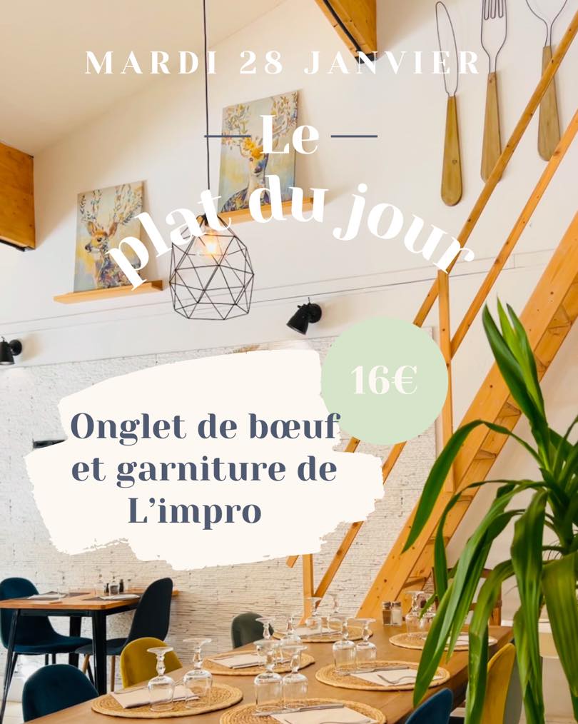 Ce midi à l’Impro -Onglet de bœuf et garniture de l’Impro 16€.