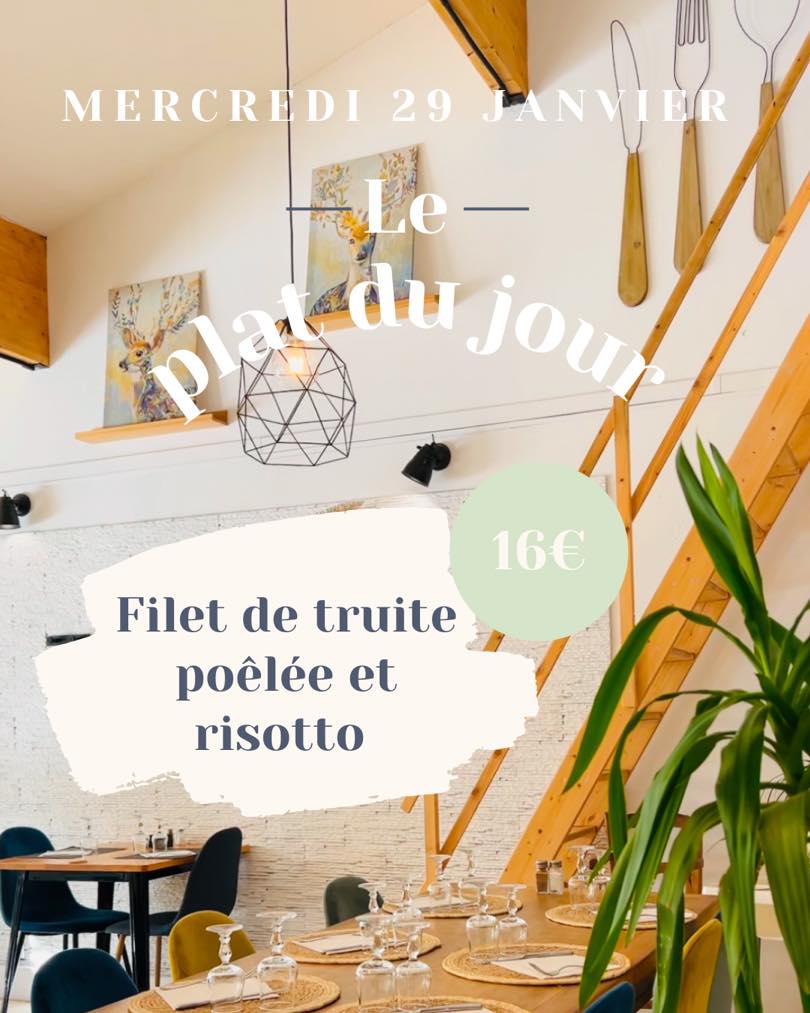 Ce midi à l’Impro : Filer de truite poêlée et risotto 16€ À emporter –10%.