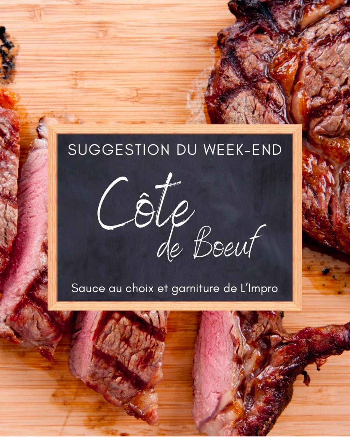 Ce dimanche l’Impro vous propose ce midi -Côte de bœuf (~500g) sauce au choix et garniture de l’Impro 30€.