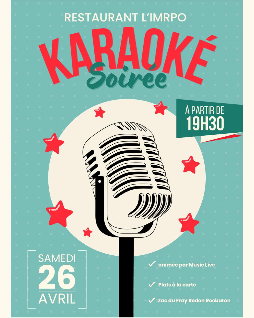 Samedi 26 avril à partir de 19h30Le restaurant l’Impro vous propose une soirée karaoké pleine de joie, de convivialité ️Animée par Sébastien, cette soirée promet de bons moments partagés autour d’un repas savoureux 🍽️ dans une ambiance chaleureuse et festive On vous attend nombreux !.