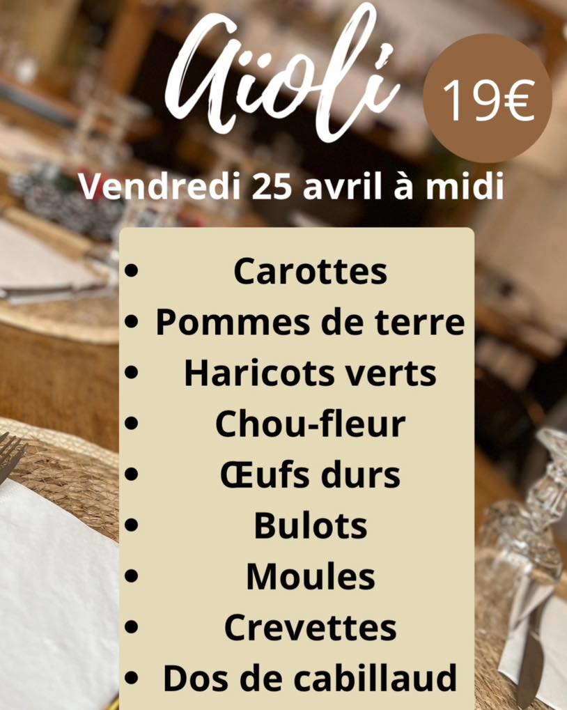 Vendredi 25 avril à midi, au restaurant l’Impro, pour une grande première, nous vous proposons notre Aïoli !Un plat traditionnel aux saveurs du Sud ️, composé de carottes 🥕, pommes de terre 🥔, haricots verts, chou-fleur 🥦, œufs durs 🥚, accompagnés de bulots, moules , crevettes 🦐 et dos de cabillaud — le tout relevé par notre délicieuse sauce aïoli maison 🧄.Pensez à réserver au 04 94 04 28 79 !.