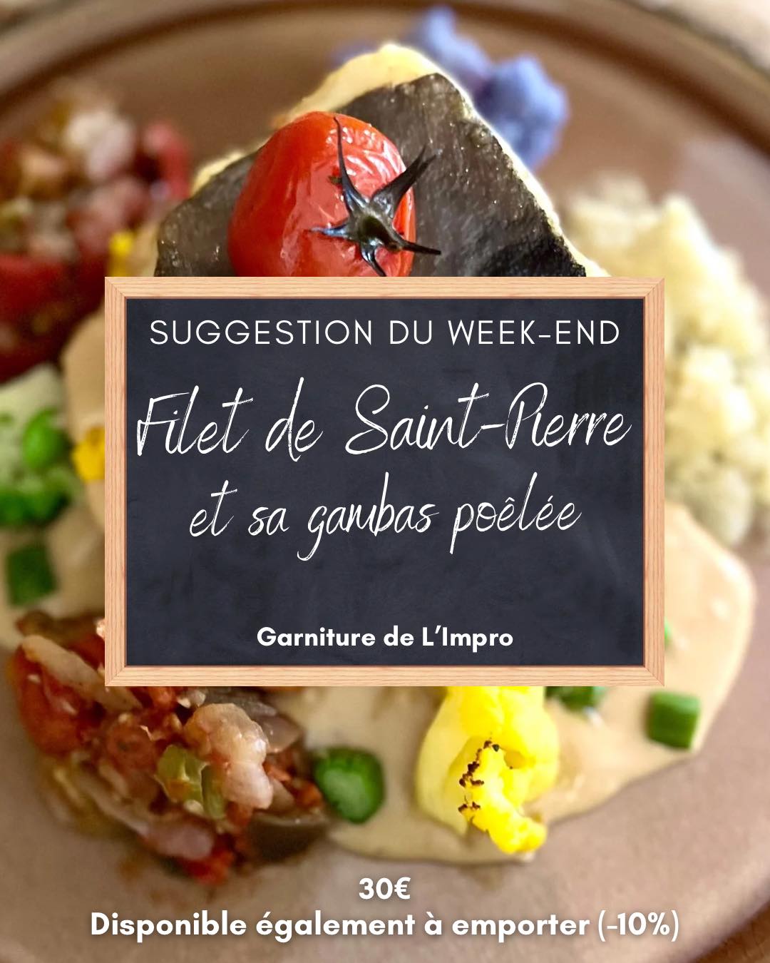 Suggestion du Week-end à l’Impro Filet de Saint-Pierre et sa gambas poêlée, garniture de l’Impro30€ – disponible également à emporter (–10%)Votre restaurant sera ouvert dimanche midi pour la fête des Pères ! .Pensez à réserver au Zac de , _____________________________________________.