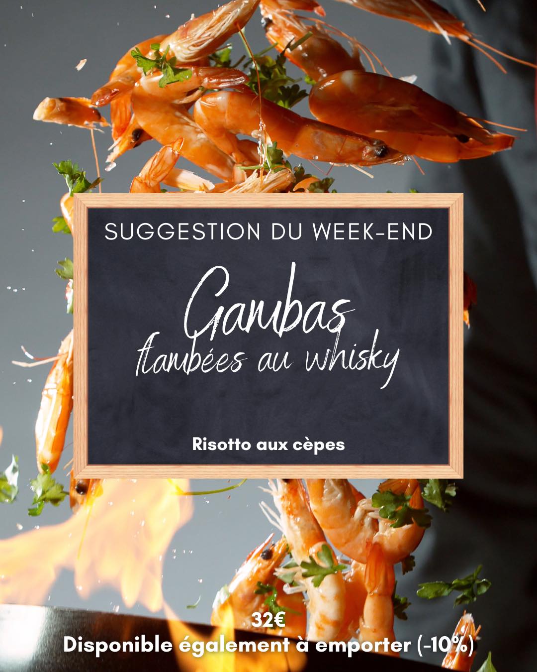 La suggestion du week-end à l’Impro Gambas flambées au whisky et risotto aux cèpes. 32€ – disponible également à emporter (–10%).Pensez à réserver au Zac de , _____________________________________________.
