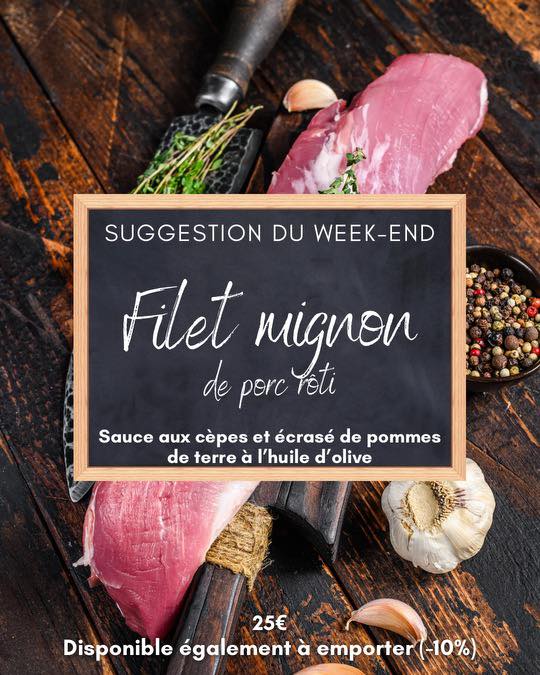 Suggestion du week-end avec la fraîcheur qui s’installe : Filet mignon de porc rôti sauce aux cèpes et écrasé de pommes de terre à l’huile d’olive Zac du Frey Redon.
