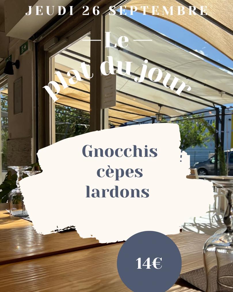 Ce midi à l’Impro : Gnocchis cèpes lardons 14€ Zac du Frey Redon.