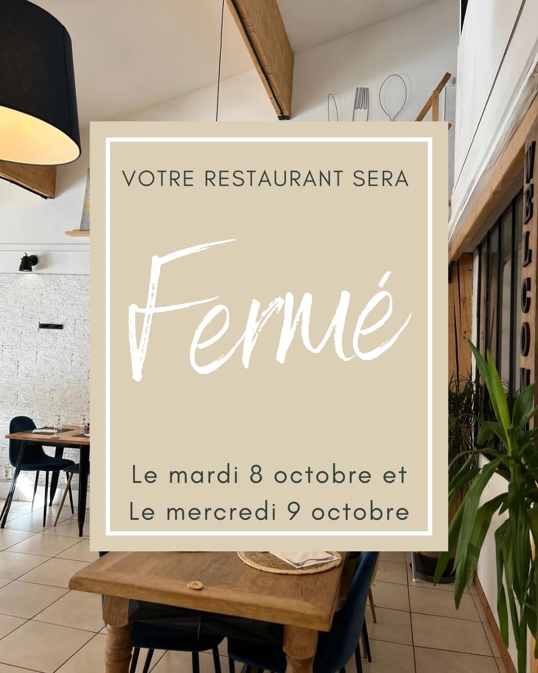 Votre restaurant sera fermé le mardi 8 octobre et le mercredi 9 octobre. Toute l’équipe sera ravie de vous retrouver le jeudi 10 octobre pour le service du midi !À très vite ️_____________________________________________.