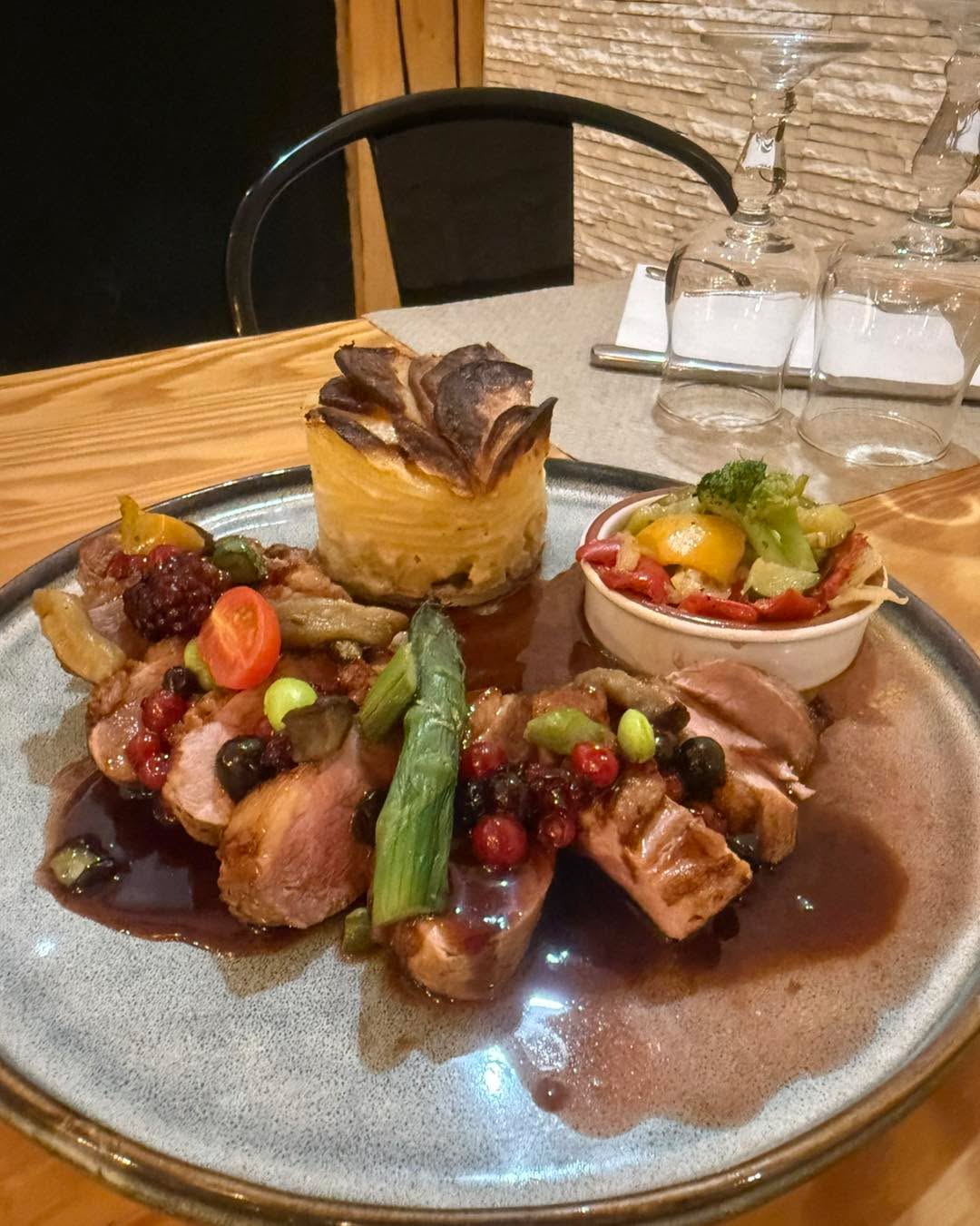 Un de nos plats à la carte – Magret de canard entier sauce aux fruits rouges Zac du Frey Redon.