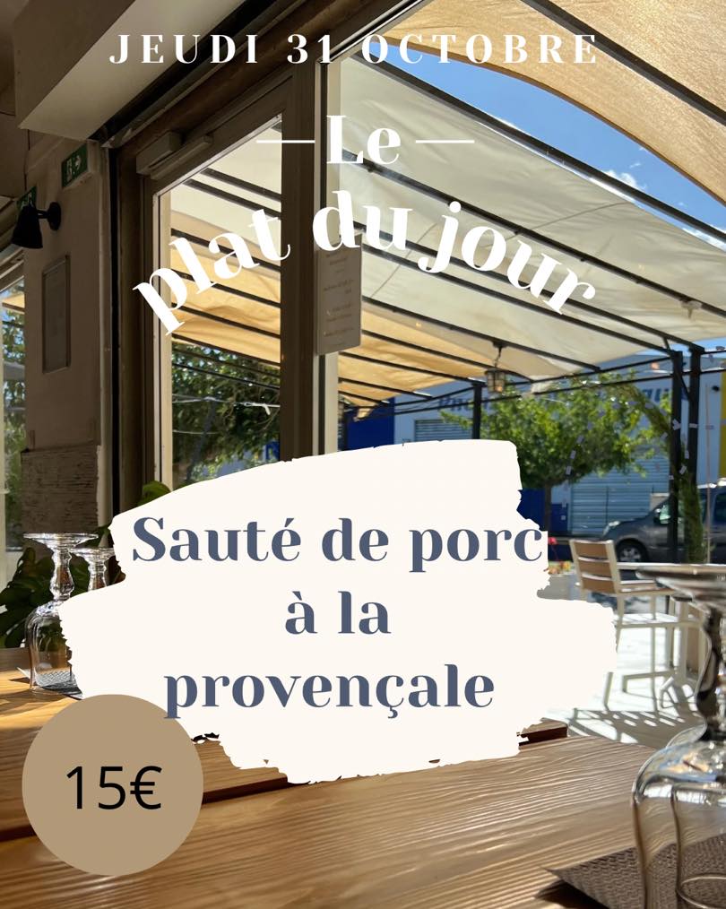 Ce midi à l’Impro – Sauté de porc à la provençale 15€ Zac du Frey Redon.
