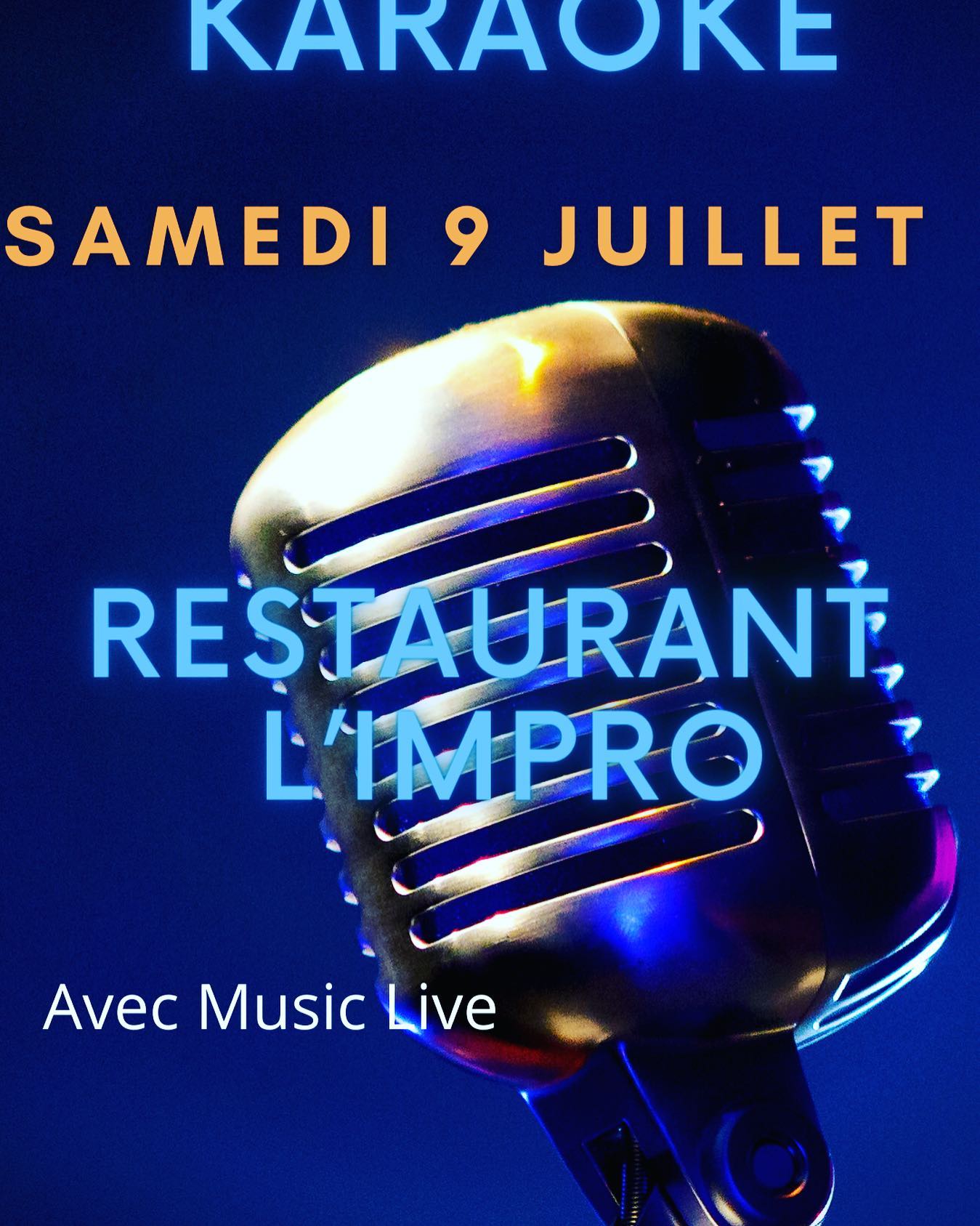 Karaoké au restaurant l’Impro -Samedi 9 juillet Avec MUSIC LIVE Pensez à réserver 06.72.42.55.19 ( sur le potable le temps des vacances )Menu à venir.