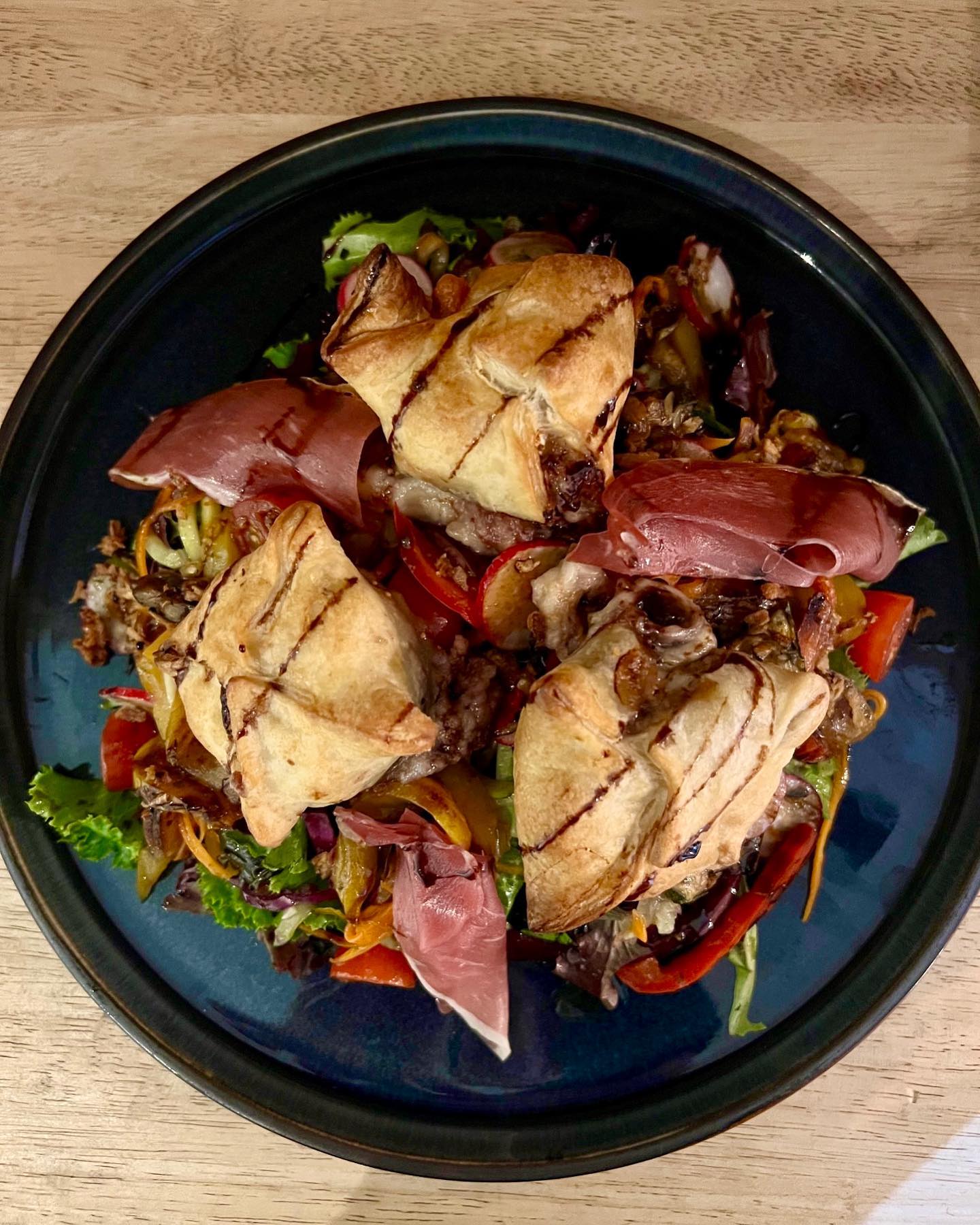 On vous attend dès ce midi avec les jolis petits feuilletés de chèvre et figue, jambon cru, salade et vinaigrette à la framboise ! Disponibles en entrée ou en plat ! Pensez à réserver au _____________________________________________.