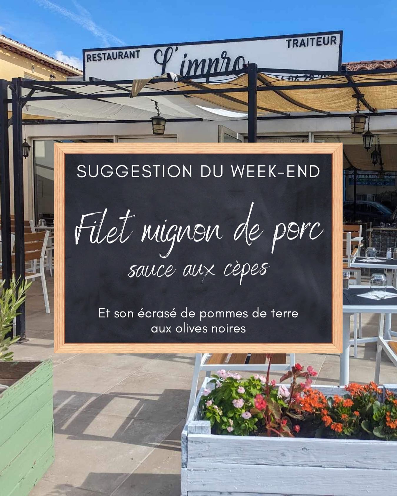 On vous retrouve dès ce soir à l’Impro avec la suggestion du Week-end Filet mignon de porc sauce aux cèpes et son écrasé de pommes de terre aux olives noires ! Pensez à réserver au _____________________________________________.