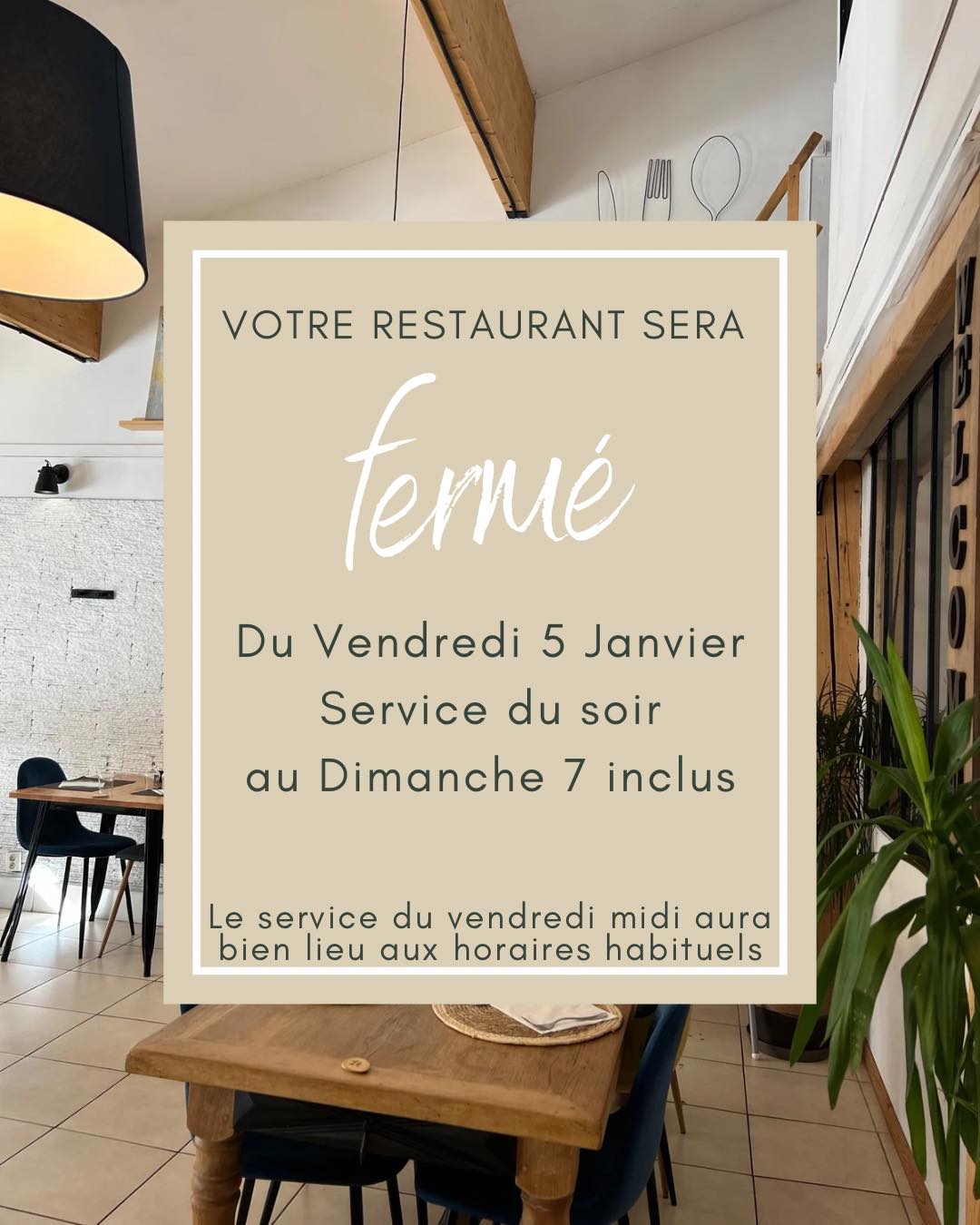 Votre restaurant sera fermé du vendredi 5 janvier service du soir au dimanche 7 inclus. Nous serons ravis de vous retrouver dès mardi 9 pour le service du midi.Belle journée Zac de , _____________________________________________.