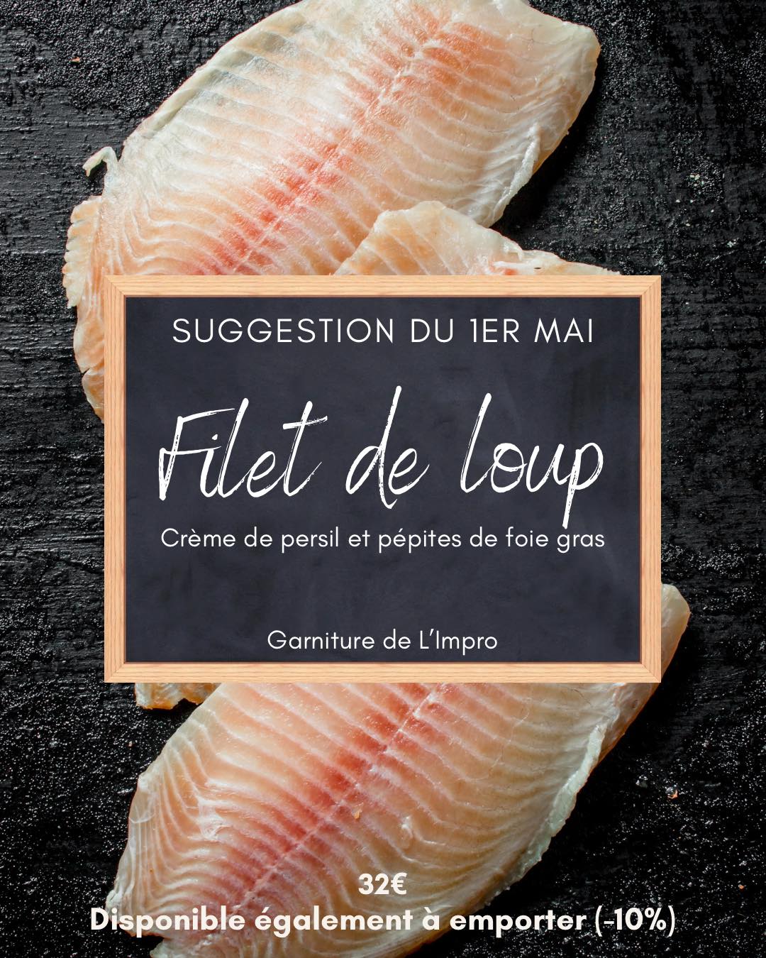 La Suggestion du 1er Mai à l’Impro Filet de loup, crème de persil et pépites de foie gras, accompagné de sa garniture de l’Impro !32€ – disponible également à emporter (–10%).Pensez à réserver au Zac de , _____________________________________________.