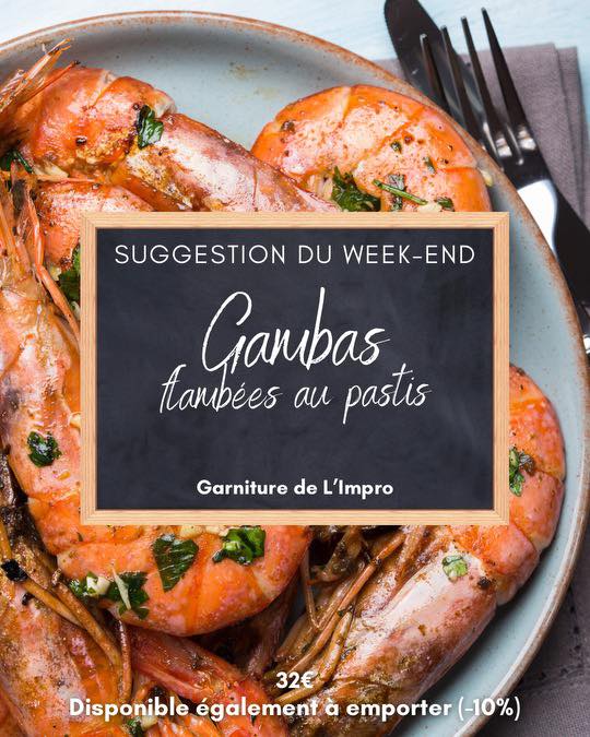 Suggestion du week-end : Gambas flambées au Pastis et garniture de l’Impro 32€ Zac du Frey Redon.