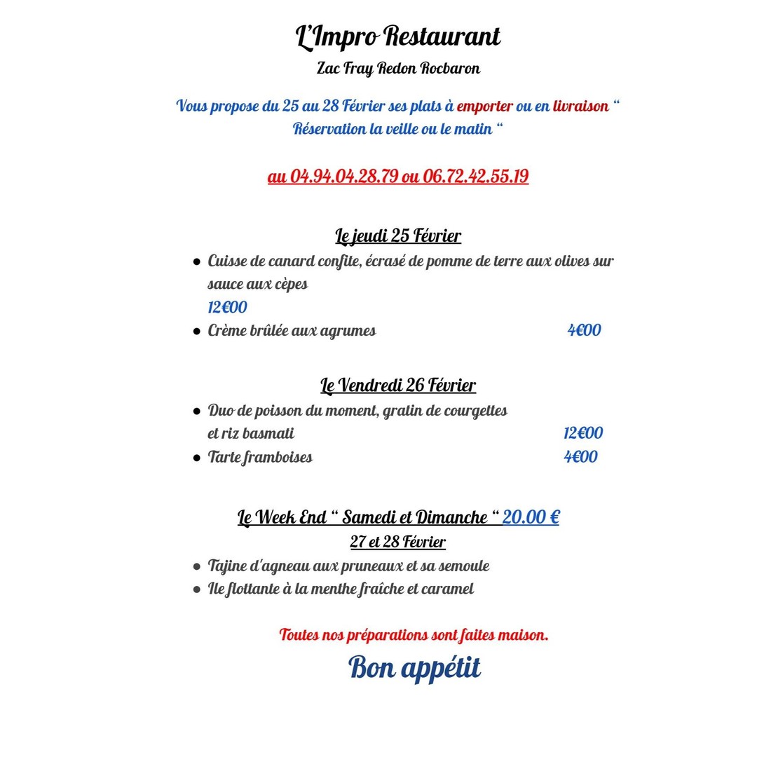 Menu de la semaine à l’Impro au 06.72.42.55.19.