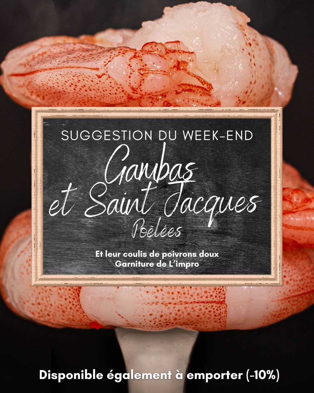 Ce week-end à l’Impro Gambas & Saint-Jacques poêlées 🌶️ Avec un délicieux coulis de poivrons doux🥔 Et notre garniture de l’Impro.32 € – Un plat plein de saveurs à ne pas manquer ! 04 94 04 28 79 ZAC du –.